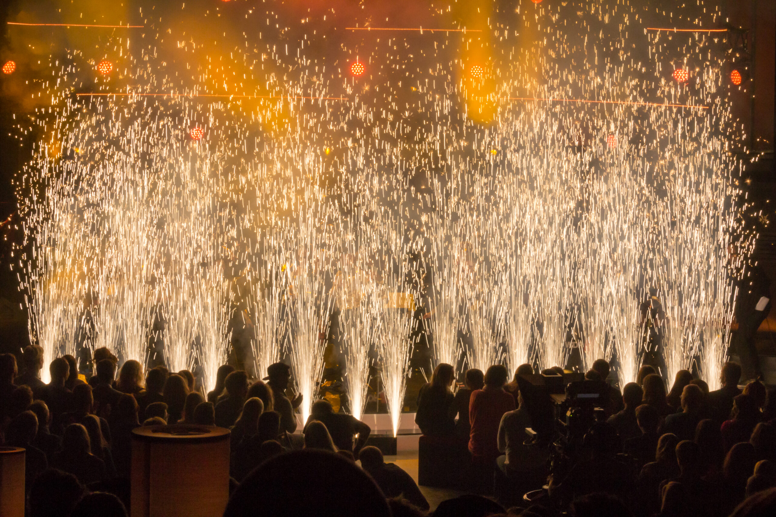 Der Kaltfunken-Effekt ist ein spektakulärer visueller Effekt, der durch spezielle Maschinen erzeugt wird, die Funkenfontänen in die Höhe schießen lassen. Diese Funken sind jedoch nicht heiß und somit ungefährlich, da sie eine andere chemische Zusammensetzung haben als herkömmliches Feuerwerk. Sie verbrennen oder entzünden nicht, was den Effekt sicher für den Einsatz in Innenräumen macht, ohne Rauch, Geruch oder Brandgefahr.